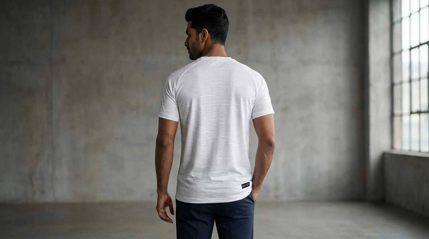 Adopting a minimalist, luxury sport aesthetic, the t-shirt showcases a center-aligned metallic logo and a subtle tonal ripple pattern across the chest. The clean white colorway offers a crisp, professional look that transitions easily from a heavy gym session to a casual post-workout meet-up. Its lightweight build and quick-dry properties make it an essential staple for active Indian lifestyles.