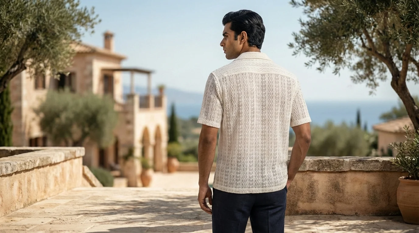 Redefine your summer wardrobe with this sophisticated off-white shirt, designed for the modern Indian man who values understated luxury. This piece features an intricate, wavy pointelle knit pattern that offers both visual depth and exceptional breathability, making it an ideal choice for humid tropical climates. The delicate texture creates a soft, tactile experience while maintaining a structured silhouette that feels effortlessly premium.