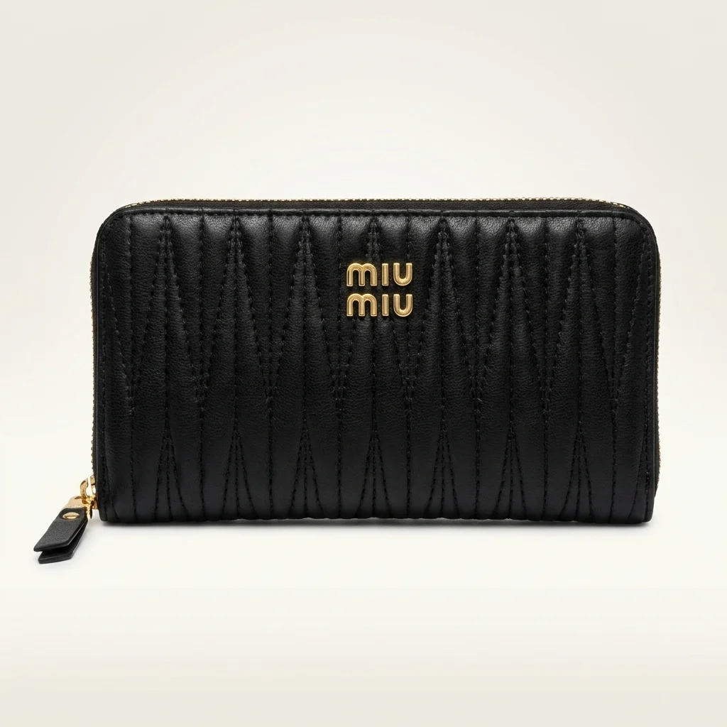 This Miu Miu Zip-Around Wallet is a testament to Italian luxury and meticulous design. Crafted from premium Nappa leather, it showcases the brand’s iconic Matelassé quilting, which creates a three-dimensional, textured aesthetic that feels as good as it looks. The sleek black exterior is complemented by polished gold-tone hardware, offering a classic color palette that pairs seamlessly with any handbag or outfit.