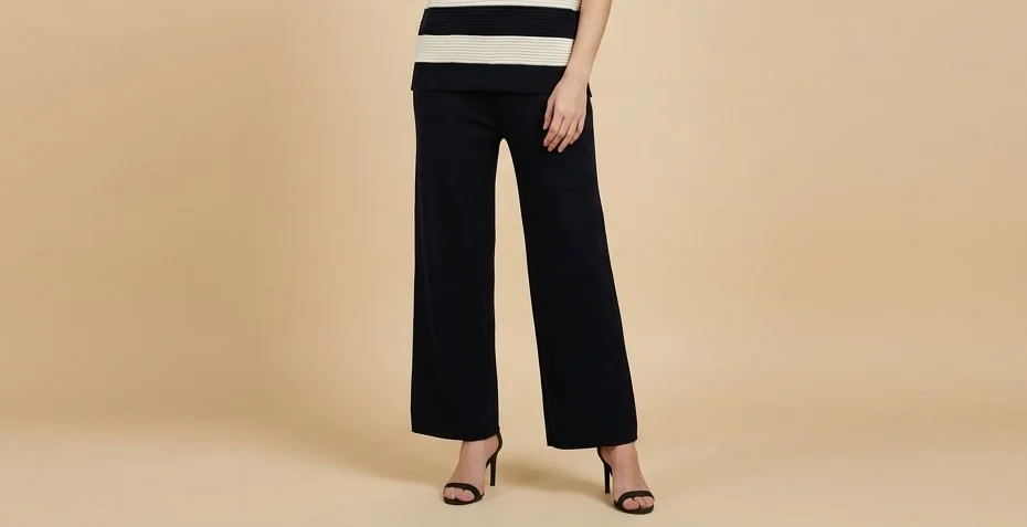 Redefine effortless sophistication with this meticulously crafted two-piece co-ord set. Featuring a timeless navy and white horizontal stripe pattern, the ensemble is designed for the modern woman who values both comfort and a high-fashion aesthetic. The top is engineered with a structured ribbed texture and a clean crew neckline, offering a contemporary silhouette that transitions seamlessly from a polished afternoon look to an evening of relaxed luxury.