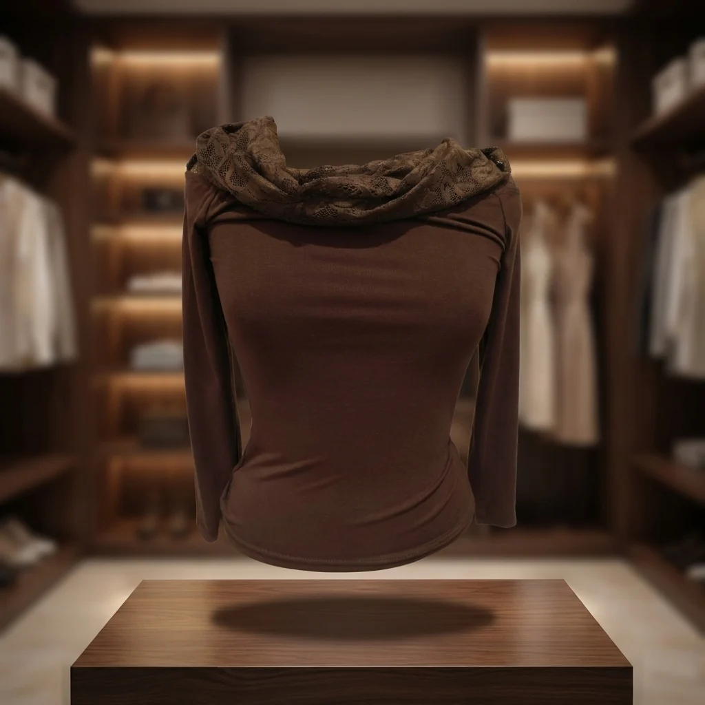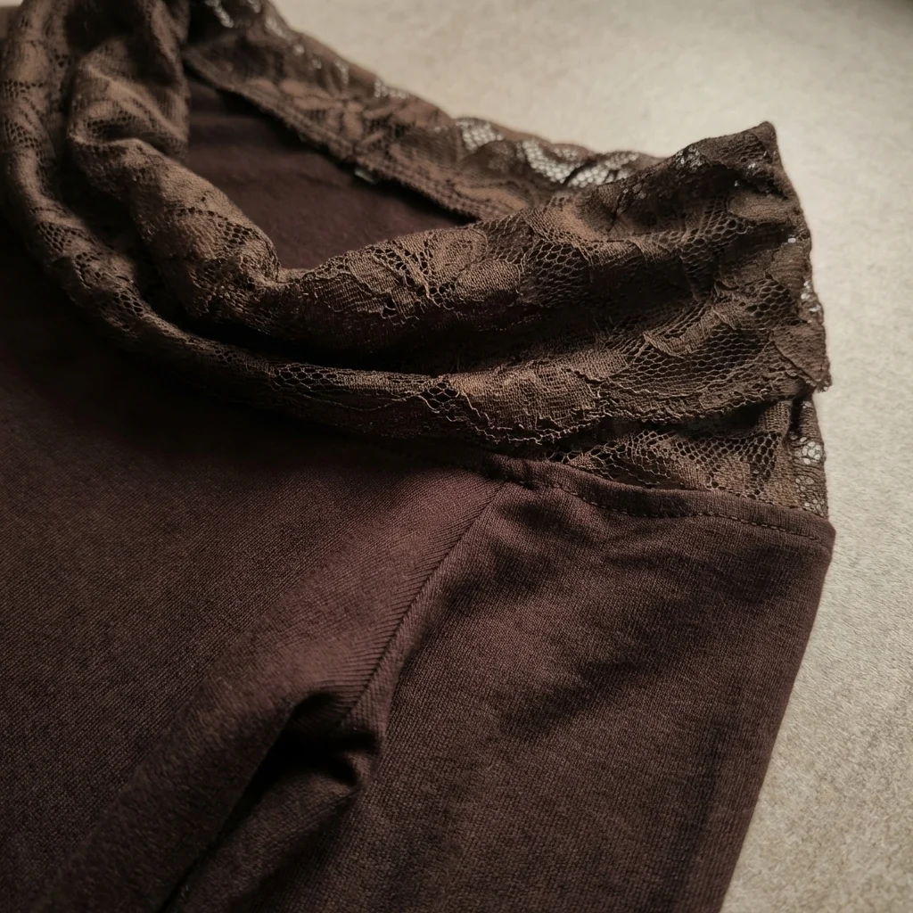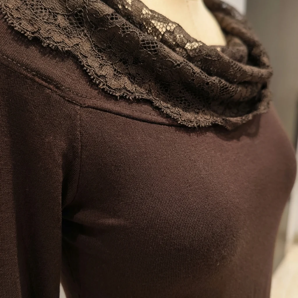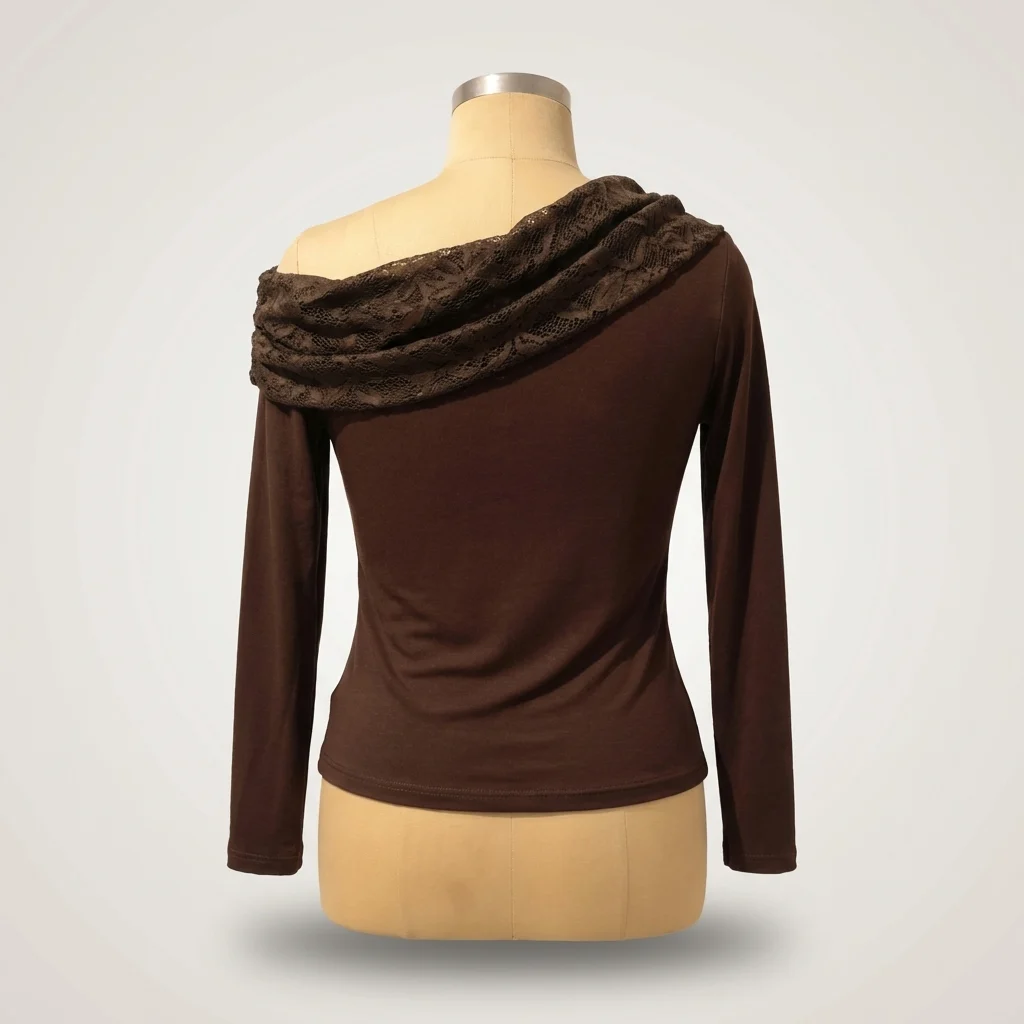 This long-sleeved top redefined minimalism with a romantic twist. Crafted in a deep cocoa brown hue, the piece centers around its striking asymmetric neckline. A voluminous layer of tonal lace drapes across the chest and over one shoulder, adding a touch of vintage-inspired texture to an otherwise sleek and contemporary design.