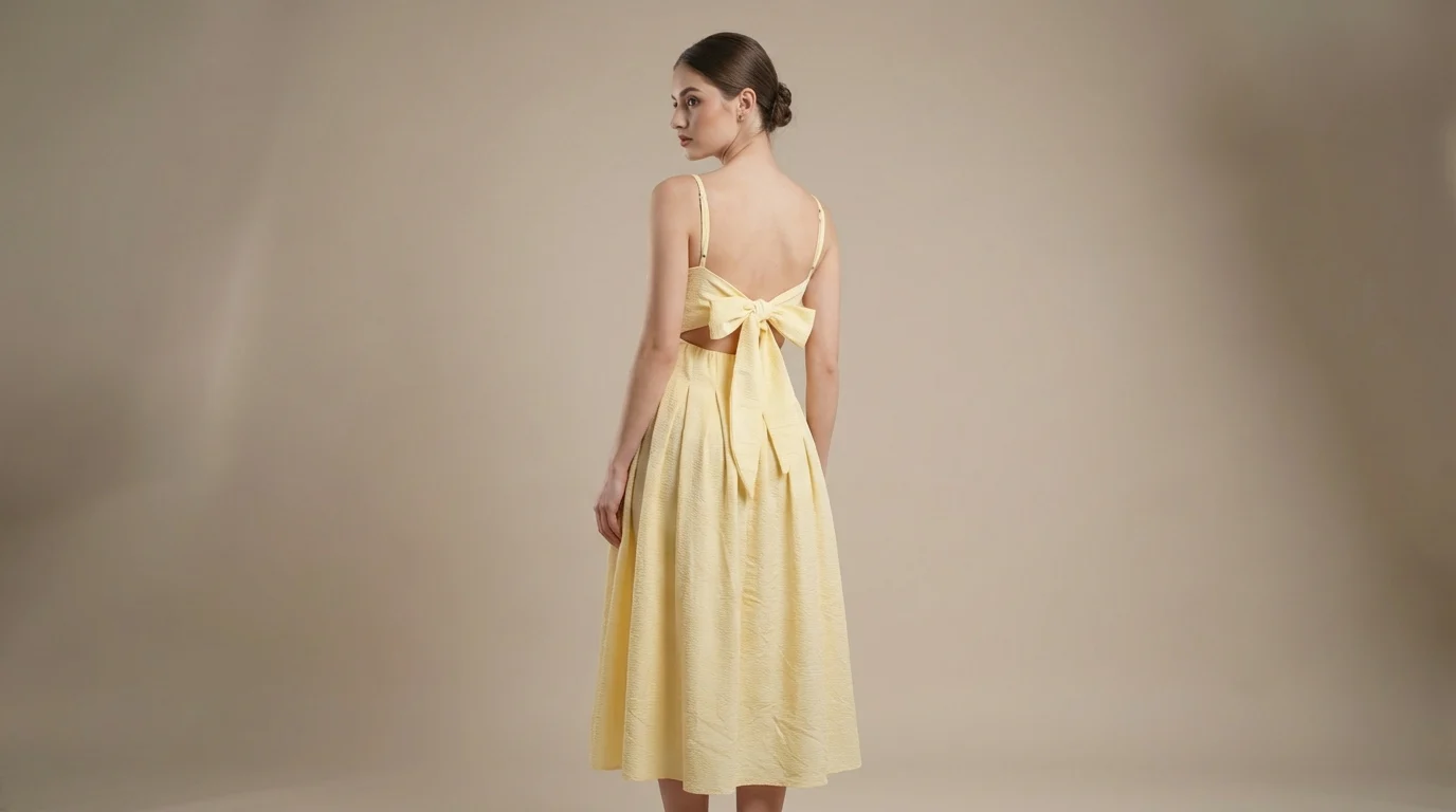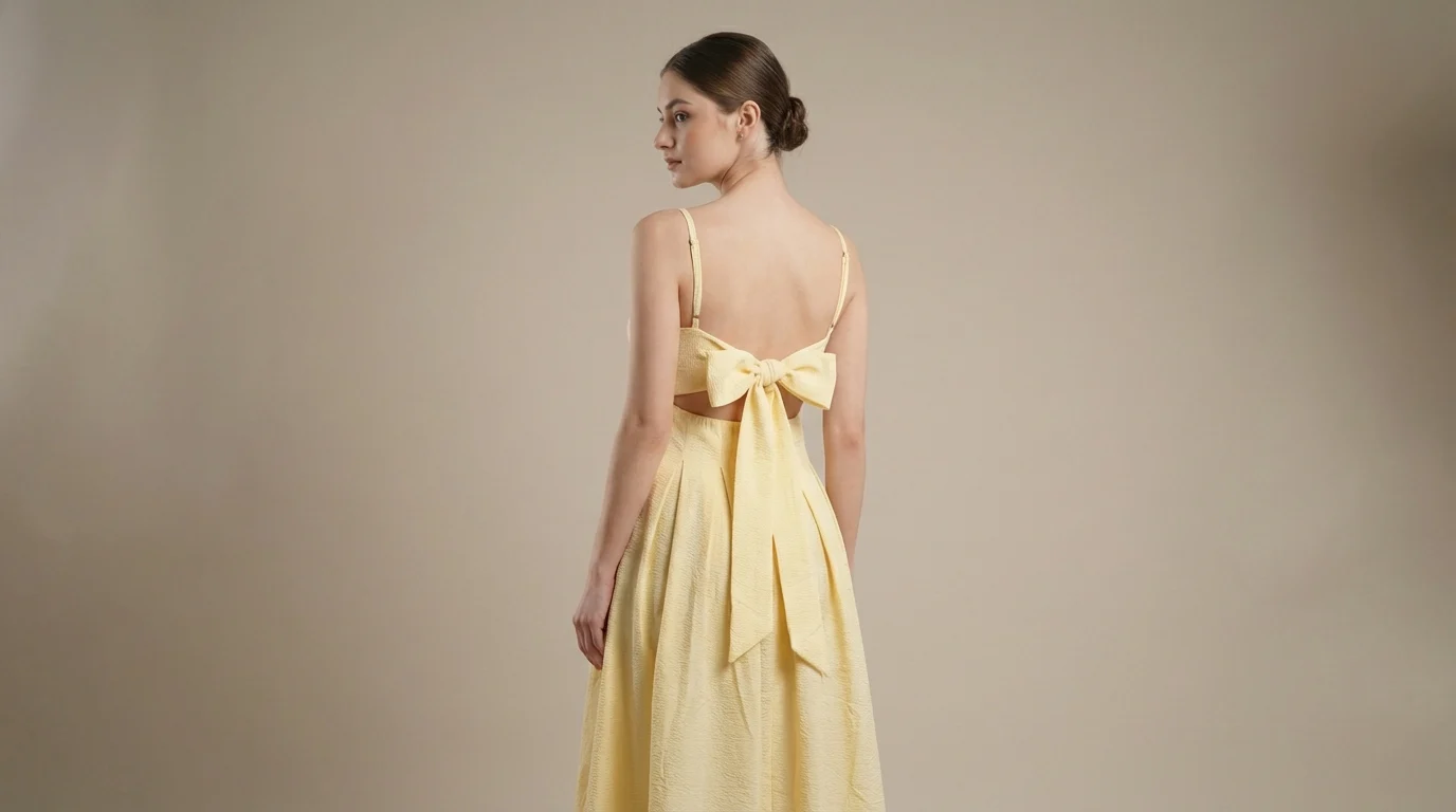 Embrace a breath of fresh air with this pale yellow midi dress, a masterclass in understated elegance. Designed for the modern woman who values both comfort and a refined aesthetic, this piece features a unique crinkle-textured fabric that adds depth and a sophisticated tactile dimension to the minimalist silhouette. The soft, buttery hue is curated to complement a variety of skin tones, making it a versatile staple for the discerning Indian wardrobe.