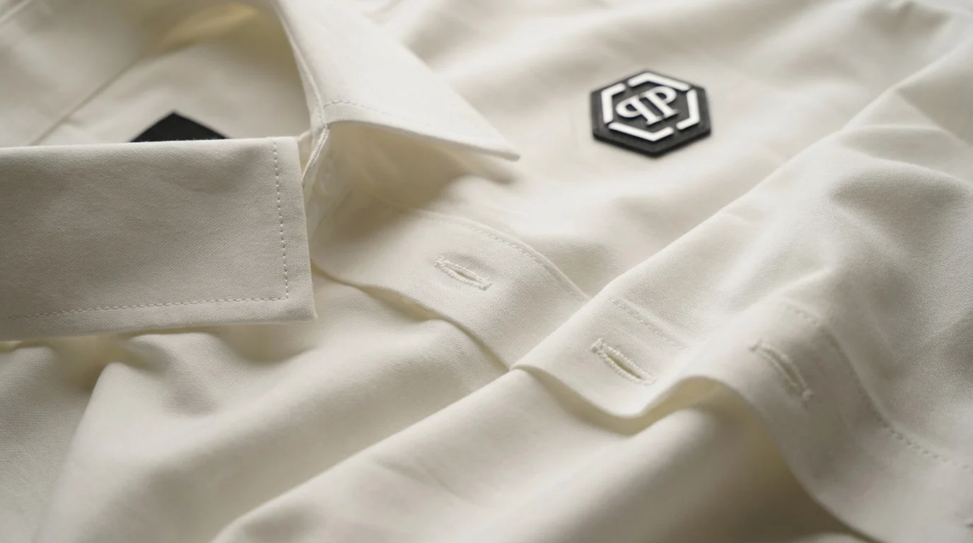 Elevate your casual attire with this Philipp Plein White Logo-Tape Premium Shirt. A masterpiece of contemporary luxury, this shirt is designed for the modern man who values bold branding and precision tailoring. The crisp white canvas is punctuated by an embossed hexagonal “PP” logo patch on the chest, signifying exclusivity and high-tier fashion.