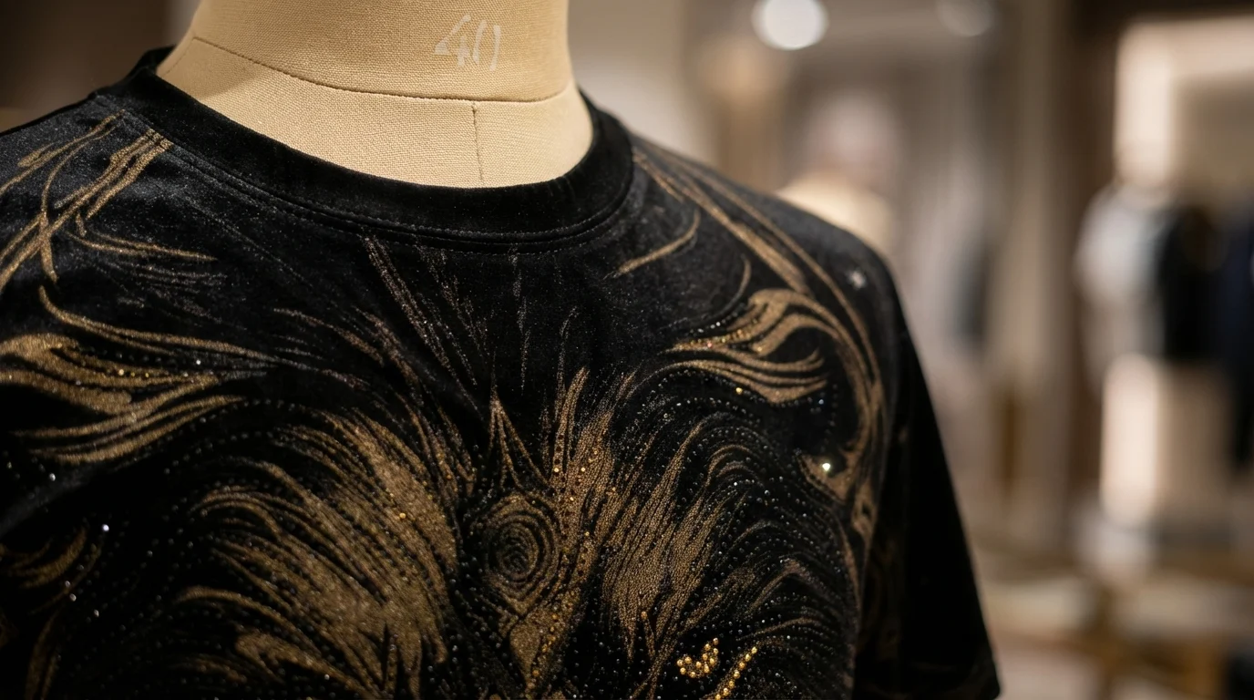 Elevate your casual repertoire with this statement piece that merges tactile luxury with bold artistry. Crafted from high-luster black velvet, this t-shirt offers a rich, multidimensional sheen that catches the light with every movement. The fabric’s plush texture provides a sophisticated alternative to standard cotton, ensuring you stand out in any high-end social setting.