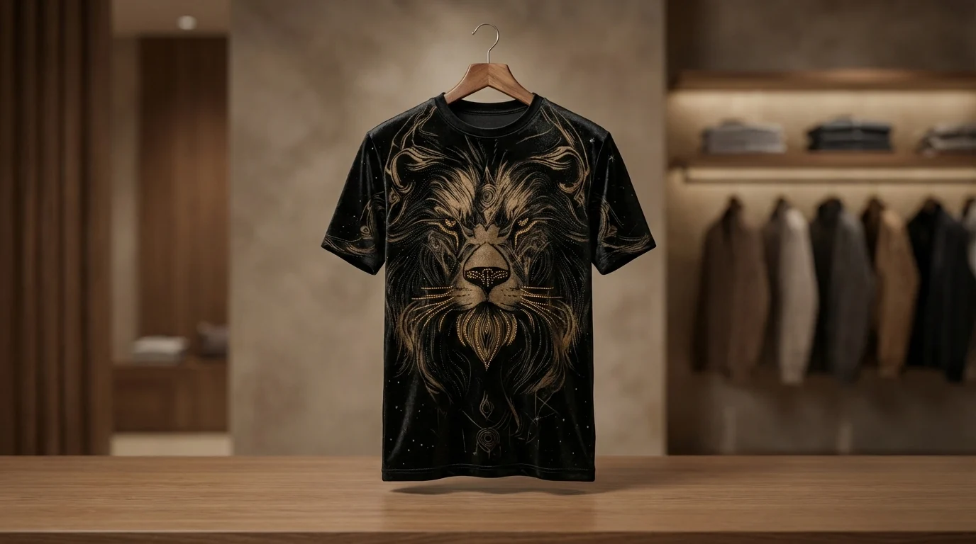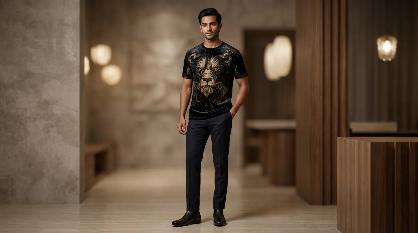 The centerpiece features an intricate, golden-toned lion graphic, rendered with a fusion of sharp linework and ethereal detailing. This majestic motif symbolizes strength and leadership, making it a perfect choice for the modern Indian man who values a commanding presence. Designed with a tailored fit and a classic crew neckline, it seamlessly transitions from premium club wear to an avant-garde evening look.