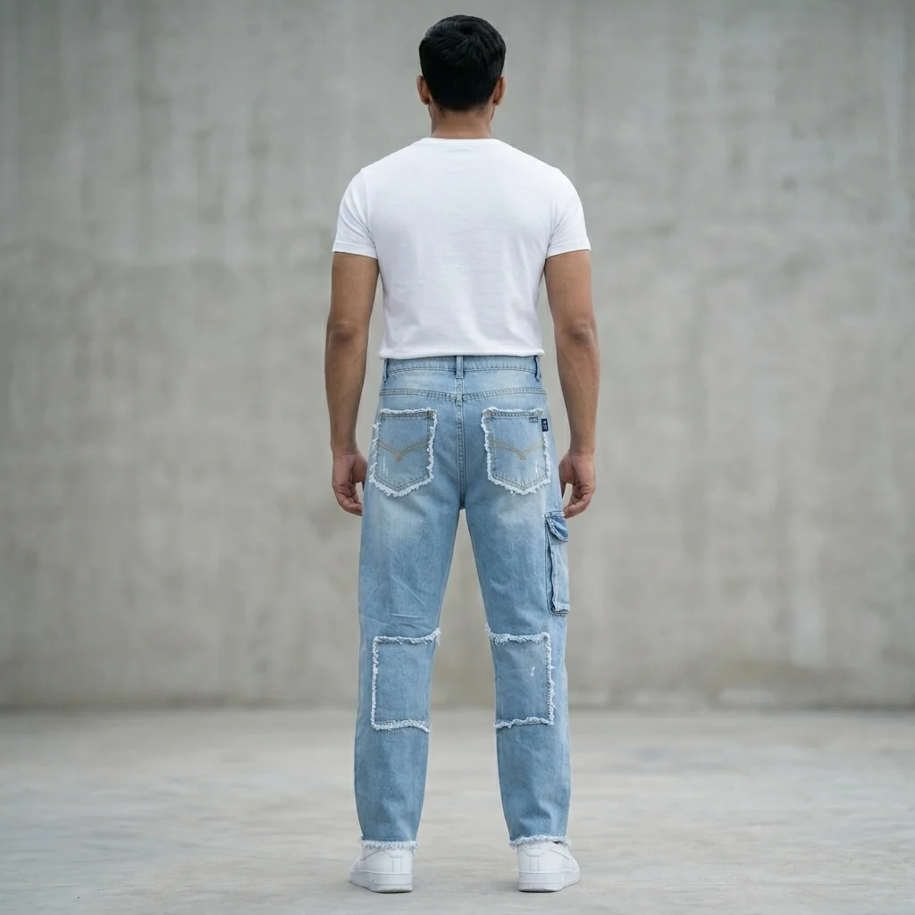 Redefine your denim collection with these Distressed Patchwork Straight Fit Jeans. Designed for those who appreciate architectural details in fashion, these jeans feature intricate, raw-hemmed overlays that create a striking geometric pattern across the front. The light indigo wash is complemented by subtle abrasions and distressing, giving them an authentic, lived-in feel from the very first wear.
