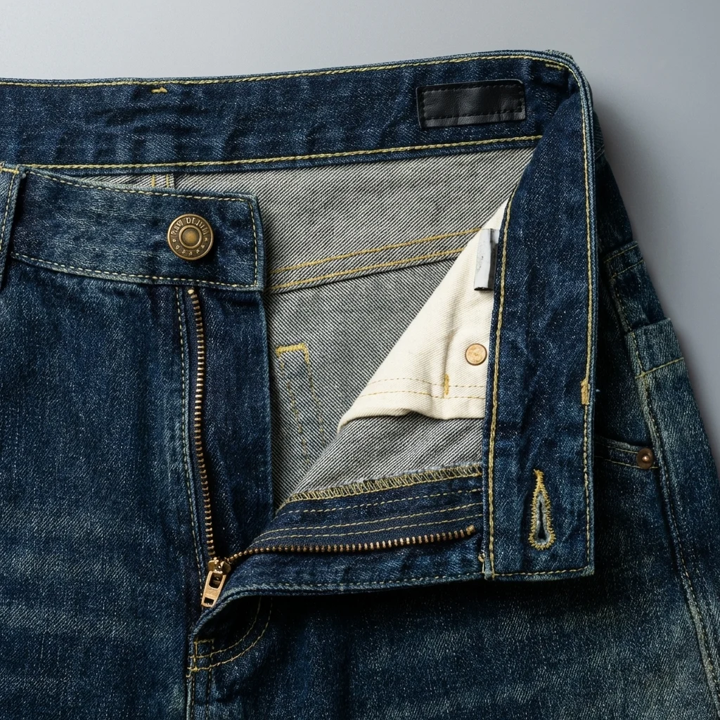 Hardware: Branded “Raw Denim” metal button and reinforced rivets.