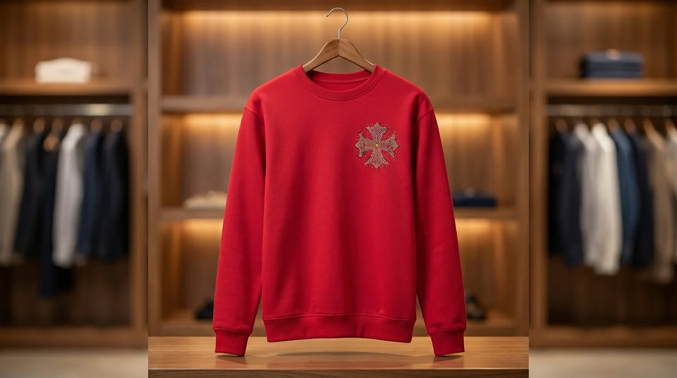 Elevate your off-duty wardrobe with this striking crimson sweatshirt, designed for the modern woman who values both comfort and a high-fashion edge. The vibrant red hue serves as a bold canvas for the intricate, hand-placed stone work on the chest, featuring a stylized cross motif that catches the light with every movement. This piece seamlessly bridges the gap between cozy loungewear and statement street style.