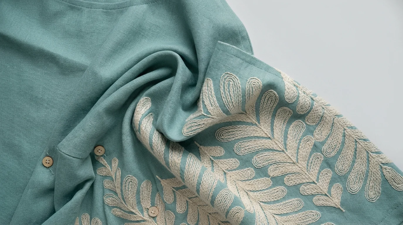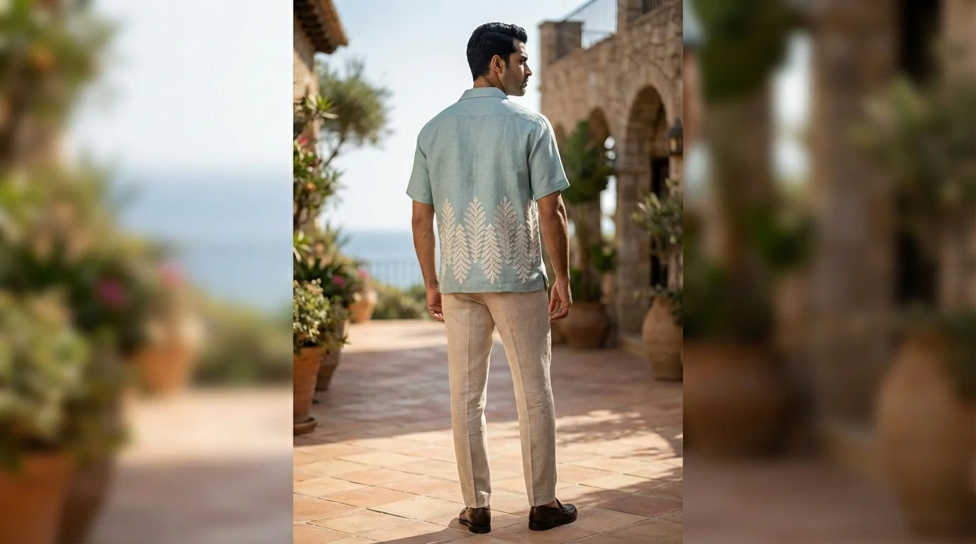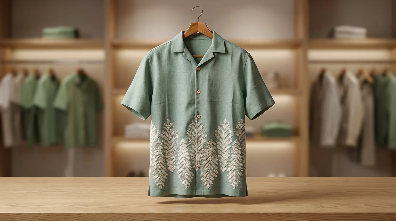 Elevate your vacation wardrobe with this meticulously crafted sage green shirt, designed for the modern man who appreciates understated luxury. The garment is cut from a premium linen-blend fabric that offers exceptional breathability and a distinct natural texture, making it an indispensable choice for India’s tropical climate. Its soft, muted hue provides a versatile canvas for the intricate white fern embroidery that climbs from the hem, adding a touch of artisanal sophistication to a classic silhouette.