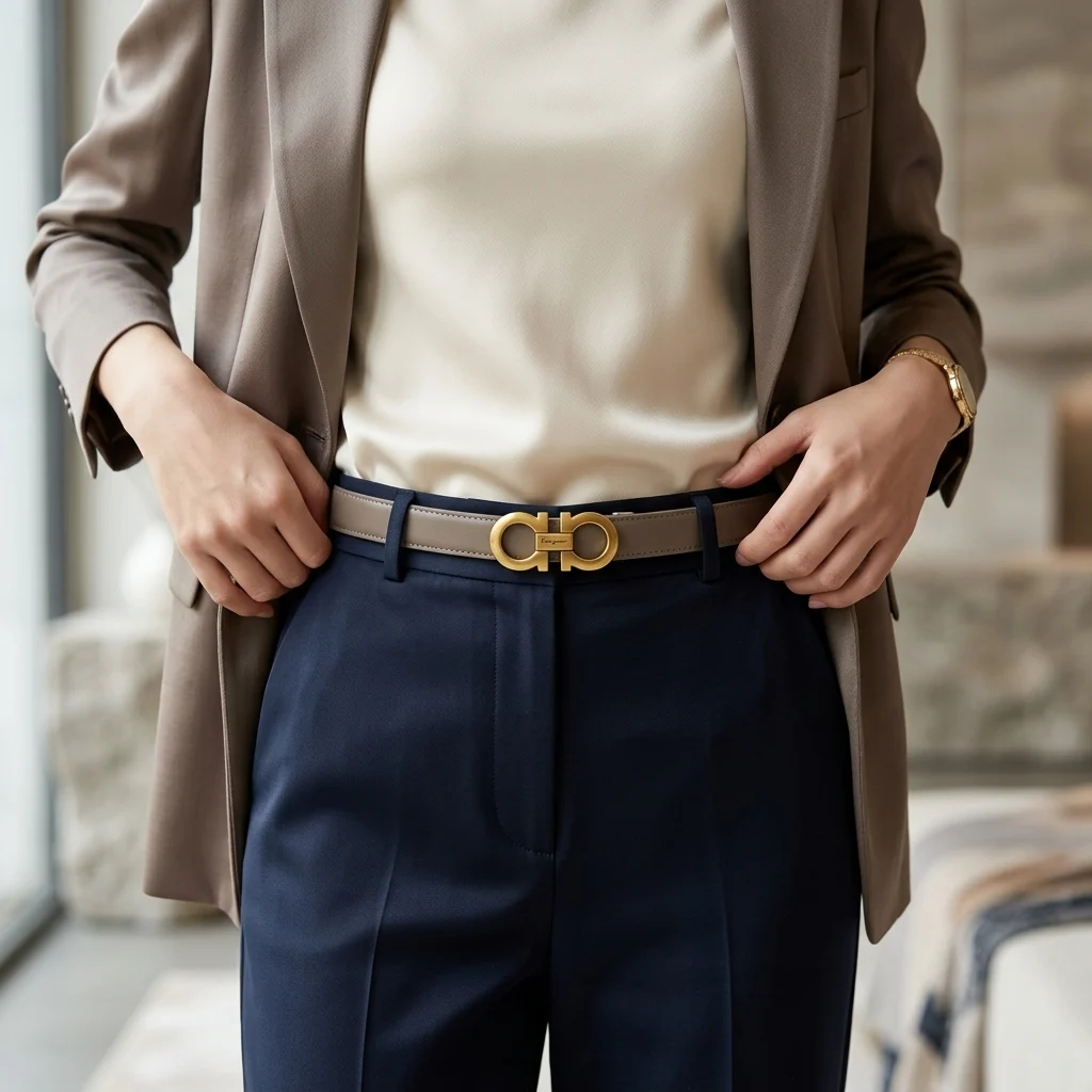 The smooth leather strap offers a buttery texture and a sophisticated taupe hue that complements a wide spectrum of colors, from deep navy trousers to neutral silk blouses. Whether you are cinching a blazer for a structured office look or adding a touch of gold to a casual dress, this belt serves as a definitive statement of taste. It is an investment piece that transcends seasonal trends, embodying the “quiet luxury” aesthetic favored by the modern woman.