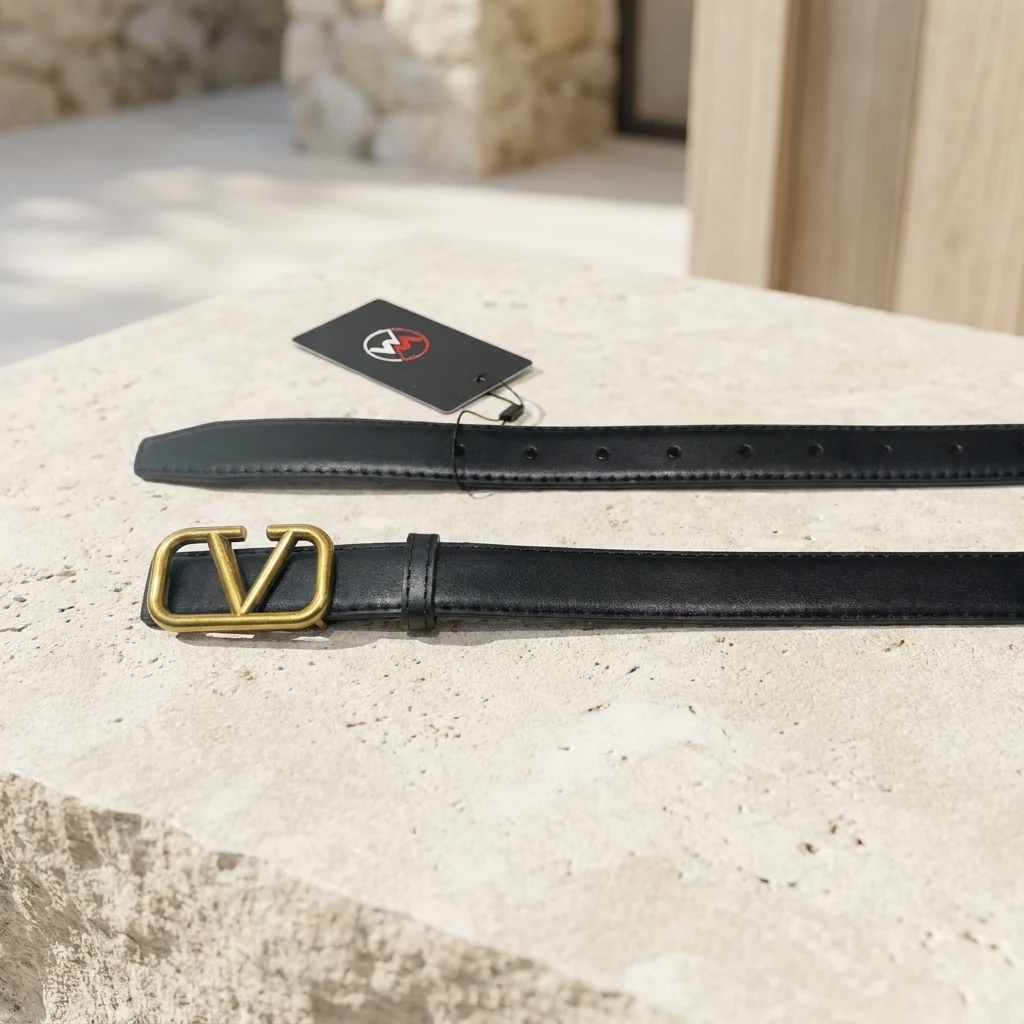 Metallic V Logo Buckle: Distinctive antique gold-finish hardware with a secure peg-and-hole closure.