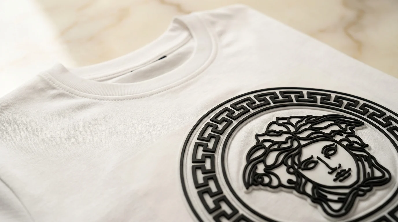 3D Tactile Branding: Raised Medusa head and Greca border logo with a unique rubberized texture.