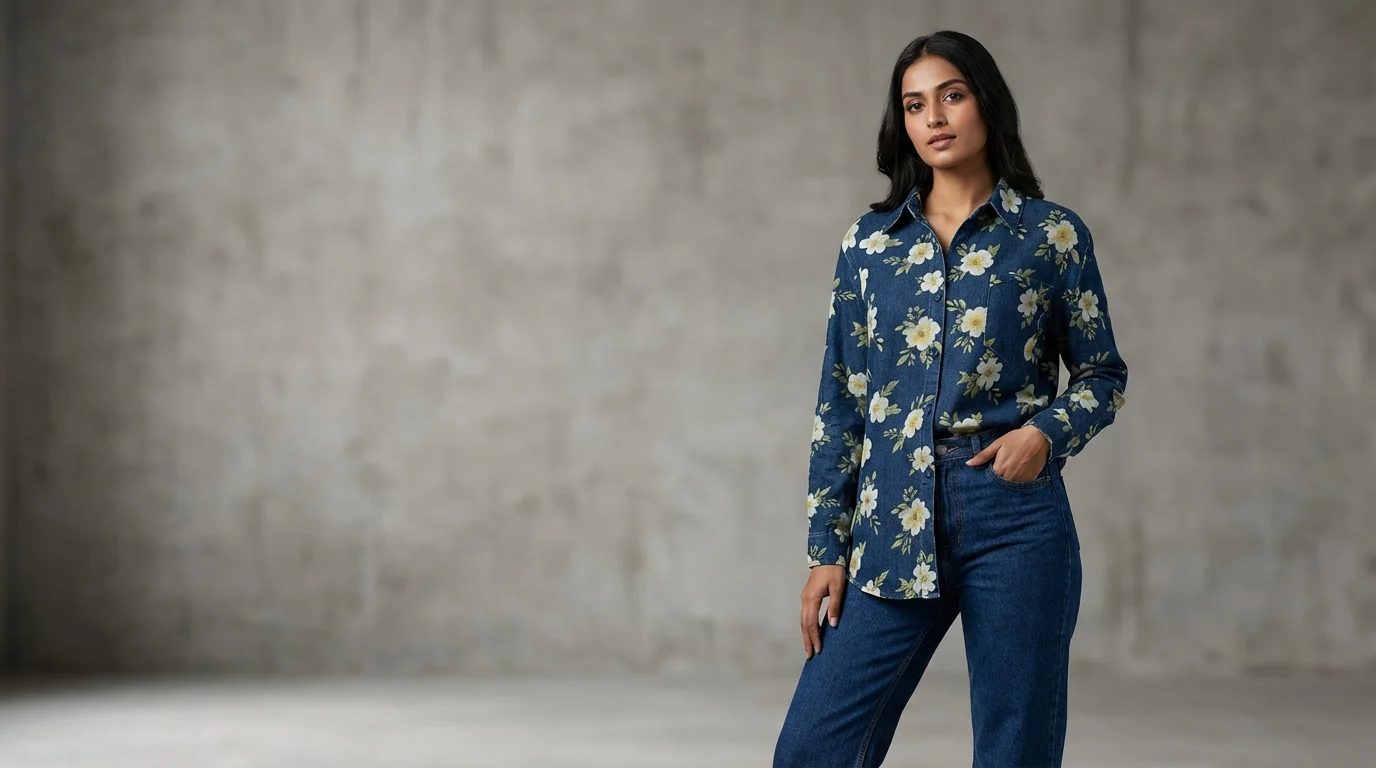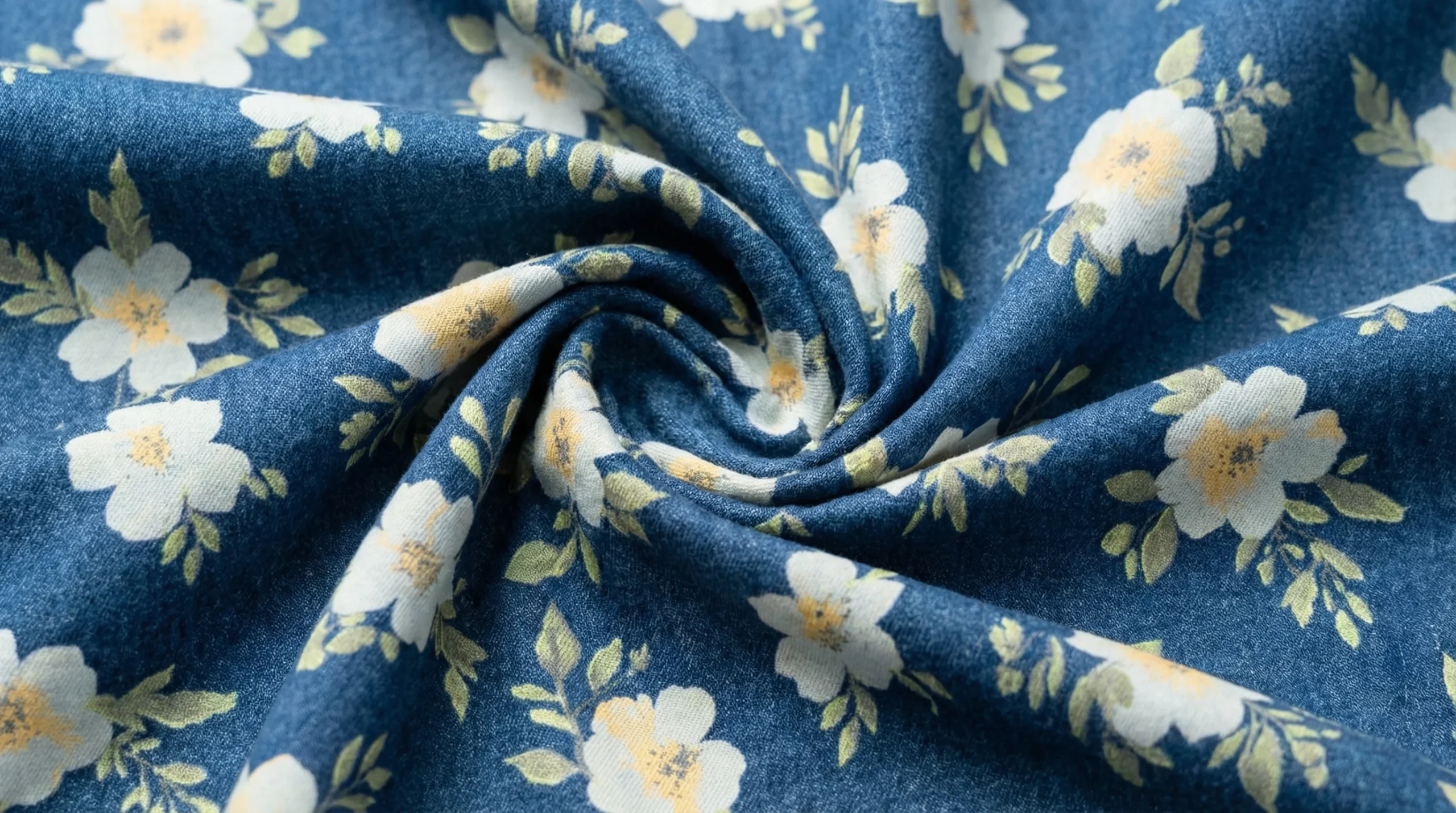 Artisanal Floral Design: Features a curated cream and yellow floral motif set against a deep indigo denim base for a sophisticated botanical look.