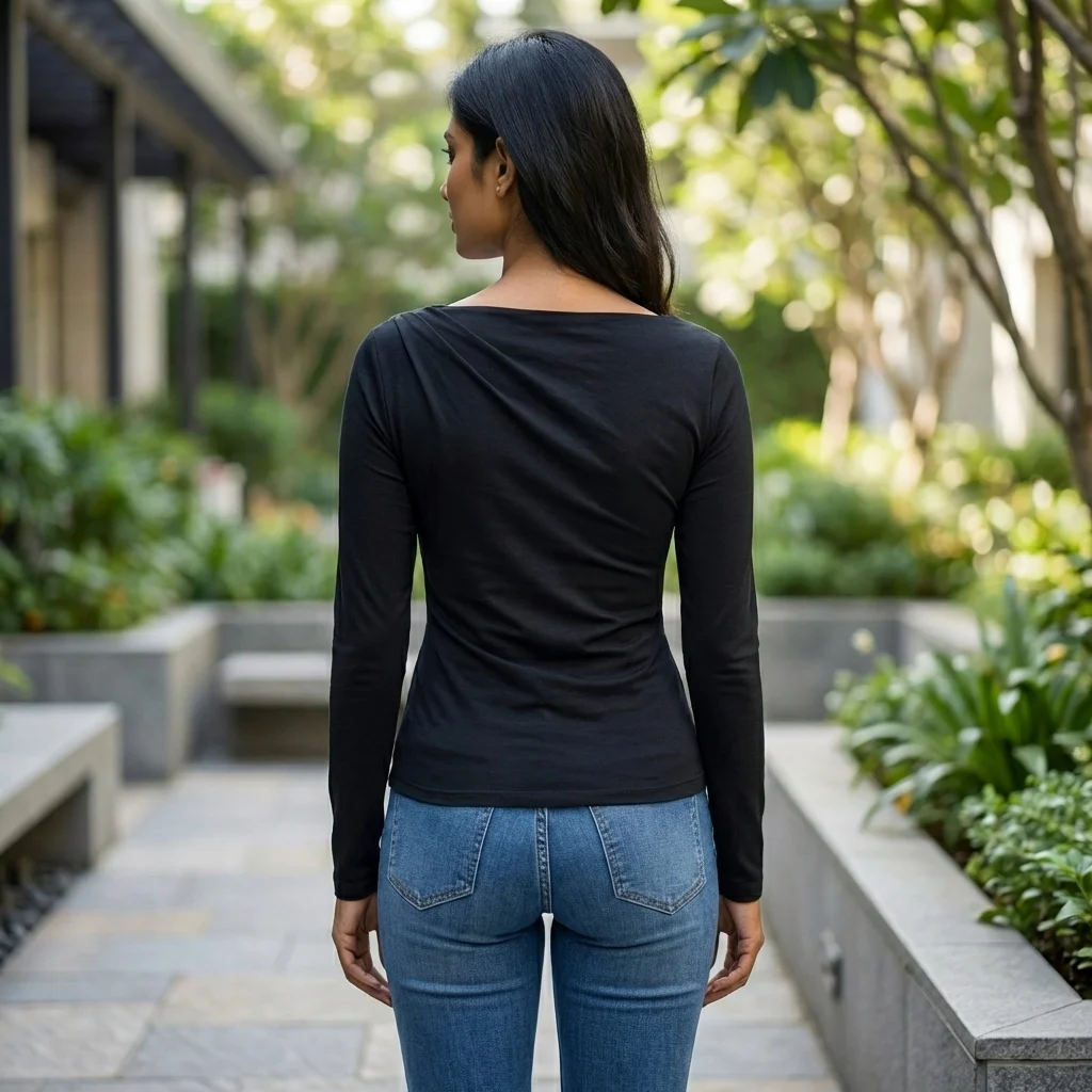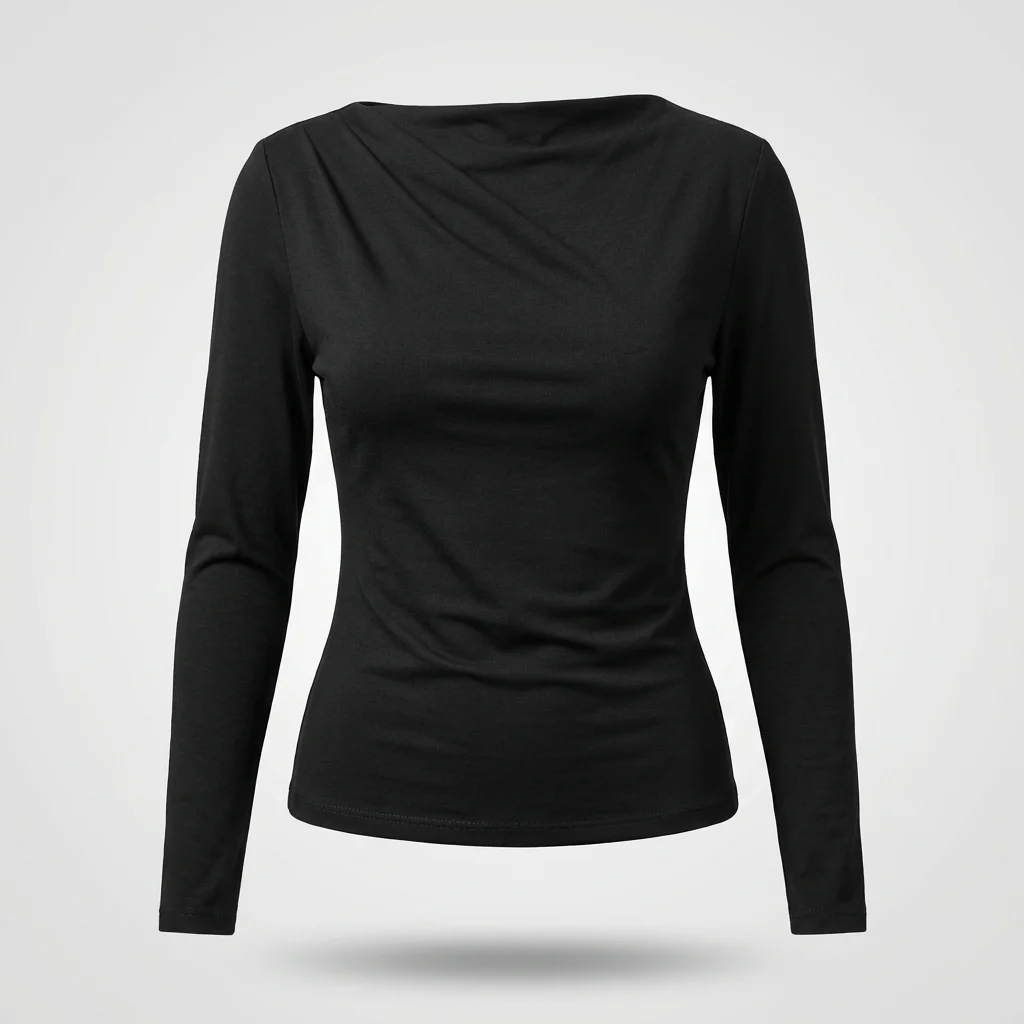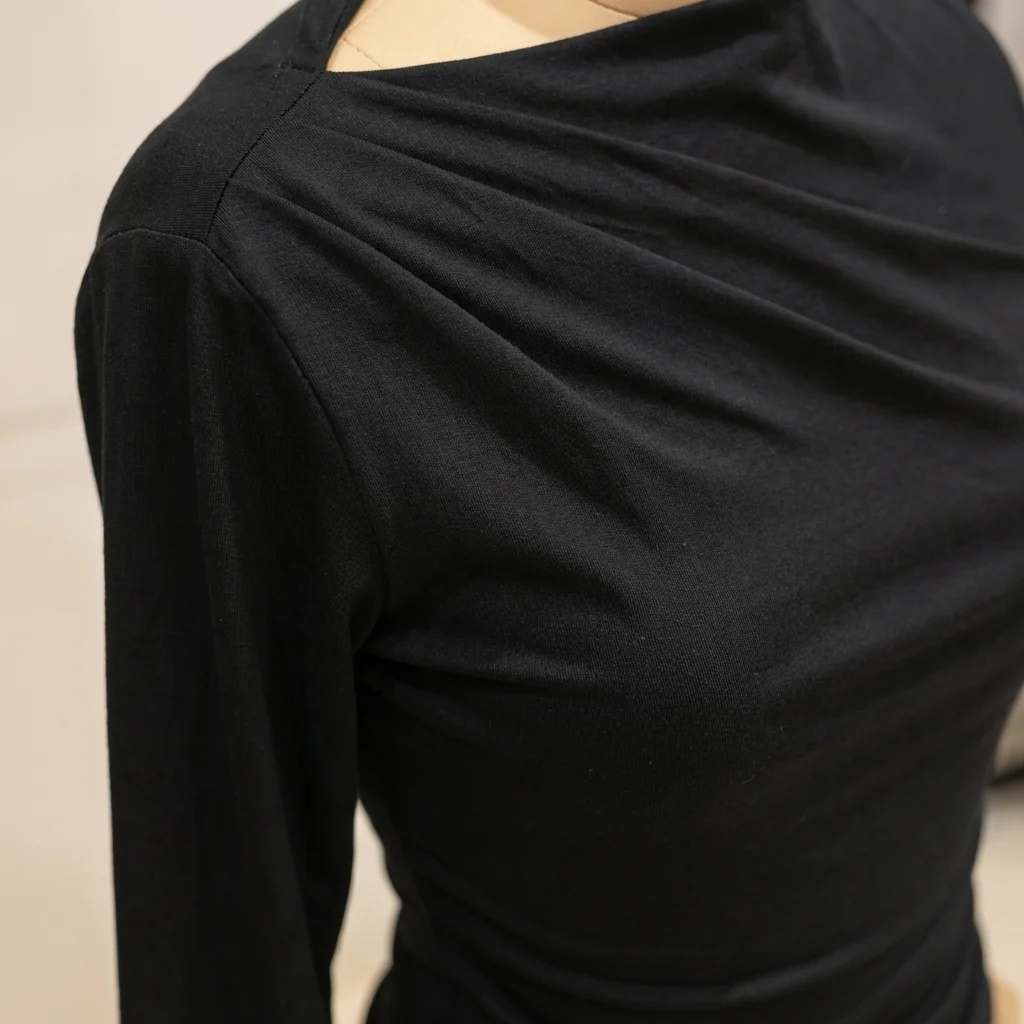 Elevate your capsule wardrobe with this masterfully draped black top. Designed for the modern woman who appreciates subtle luxury, this piece redefines the classic long-sleeve tee. The standout feature is the delicate gathering at the neckline, which adds a sculptural dimension and a refined aesthetic to the deep black silhouette.
