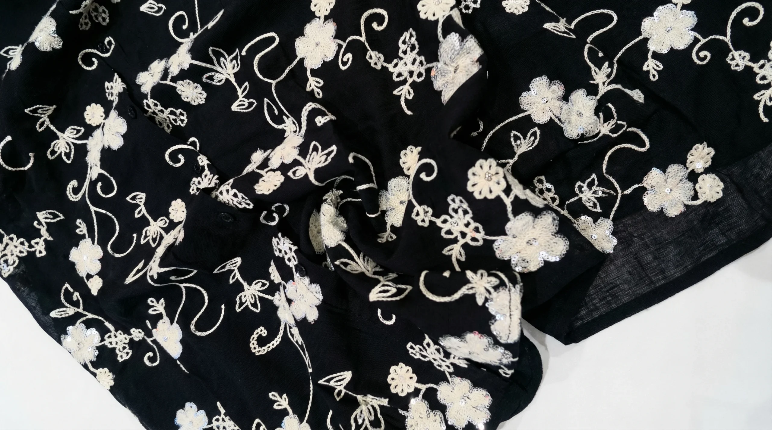 Artisanal Floral Embroidery: Features intricate white vine and floral embroidery on a premium black base for a sophisticated contrast.