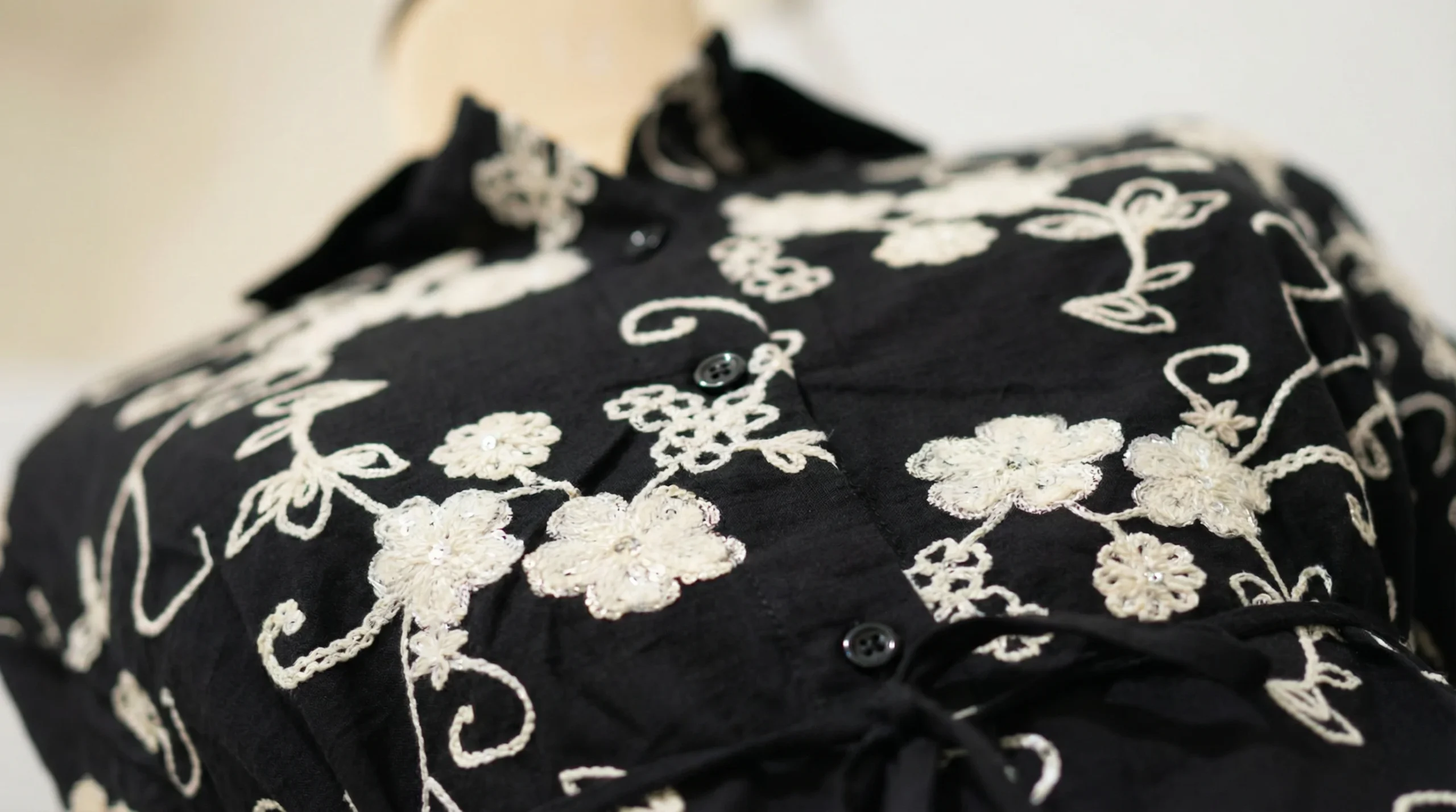 Embroidery: High-contrast white floral and vine embroidery on the front and sleeves of the shirt.