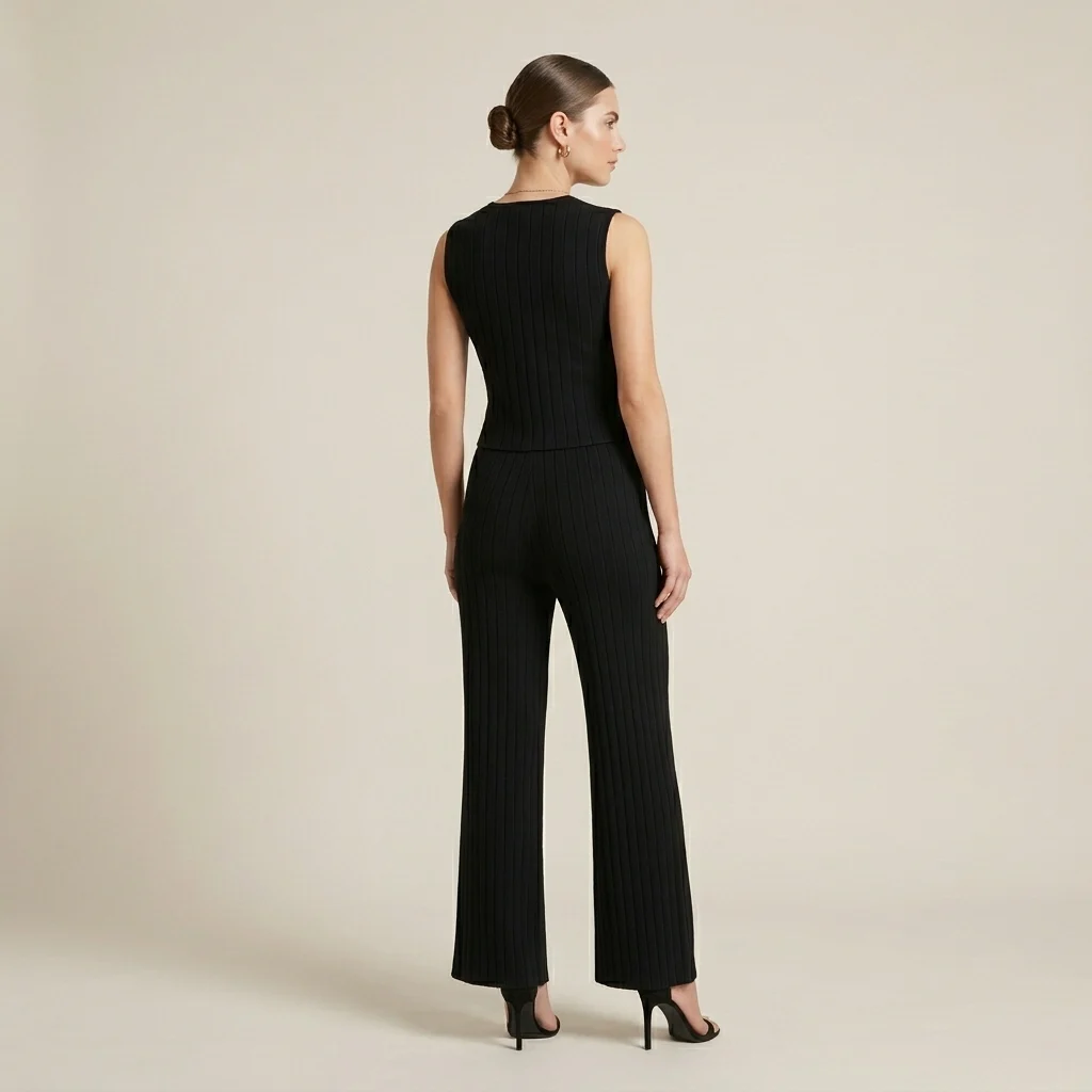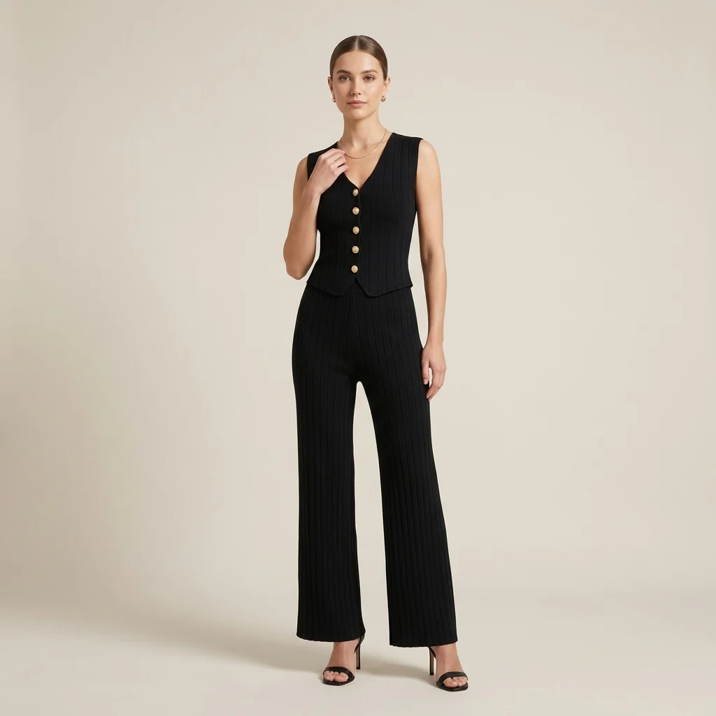 Chic Co-ord Styling: A sophisticated two-piece set featuring a tailored V-neck waistcoat and matching wide-leg trousers.
