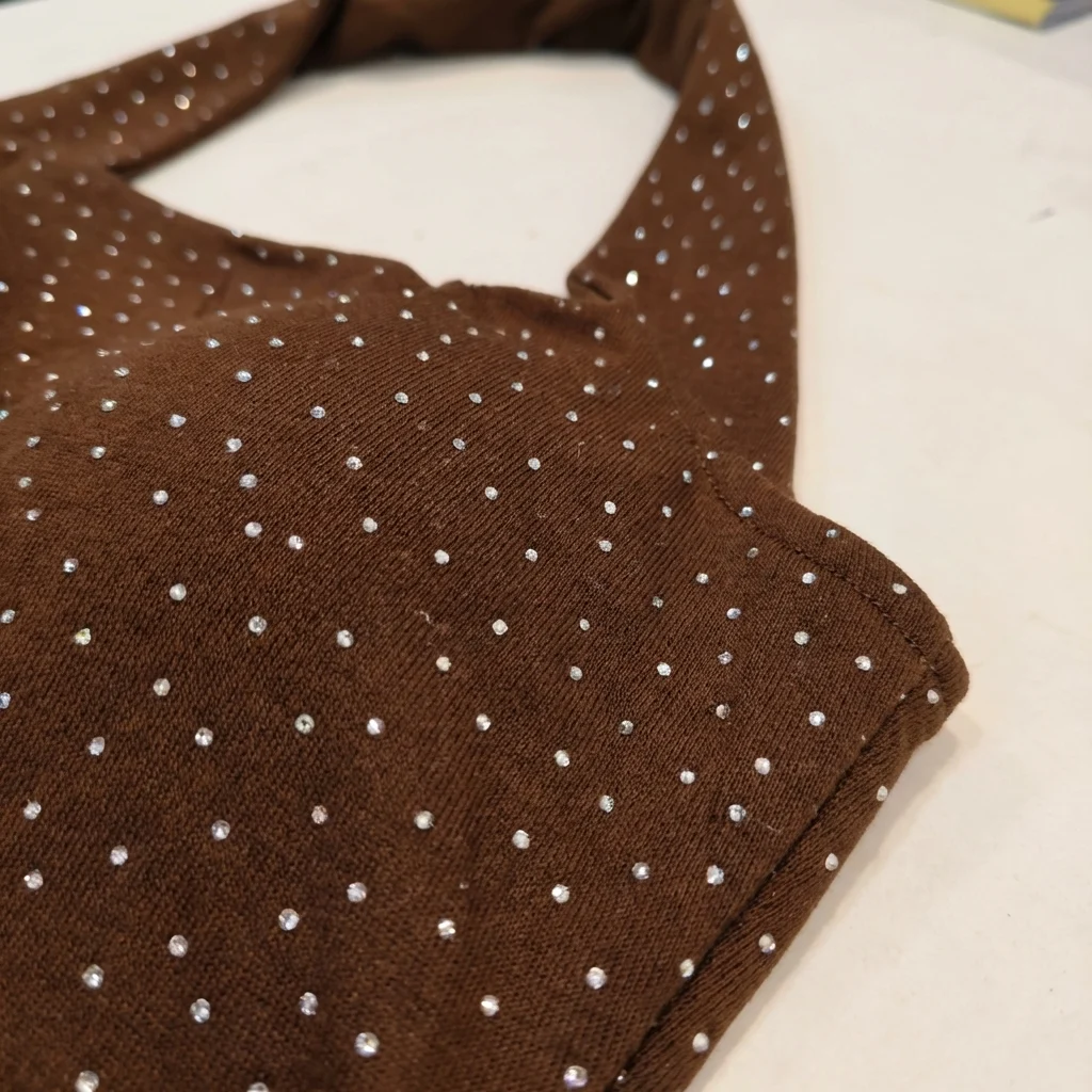 This brown halter top combines classic Parisian charm with modern femininity. Designed with a flattering square-cut neckline and a secure halter tie, it emphasizes the shoulders while providing a streamlined, form-fitting silhouette. The deep chocolate hue serves as a rich canvas for the intricate, silver-toned shimmering dots, adding a touch of understated glamour to your wardrobe.