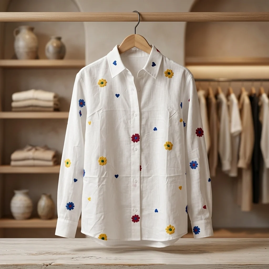 • Artisanal Embroidery: Delicate multi-color floral and heart motifs scattered across a crisp white base.