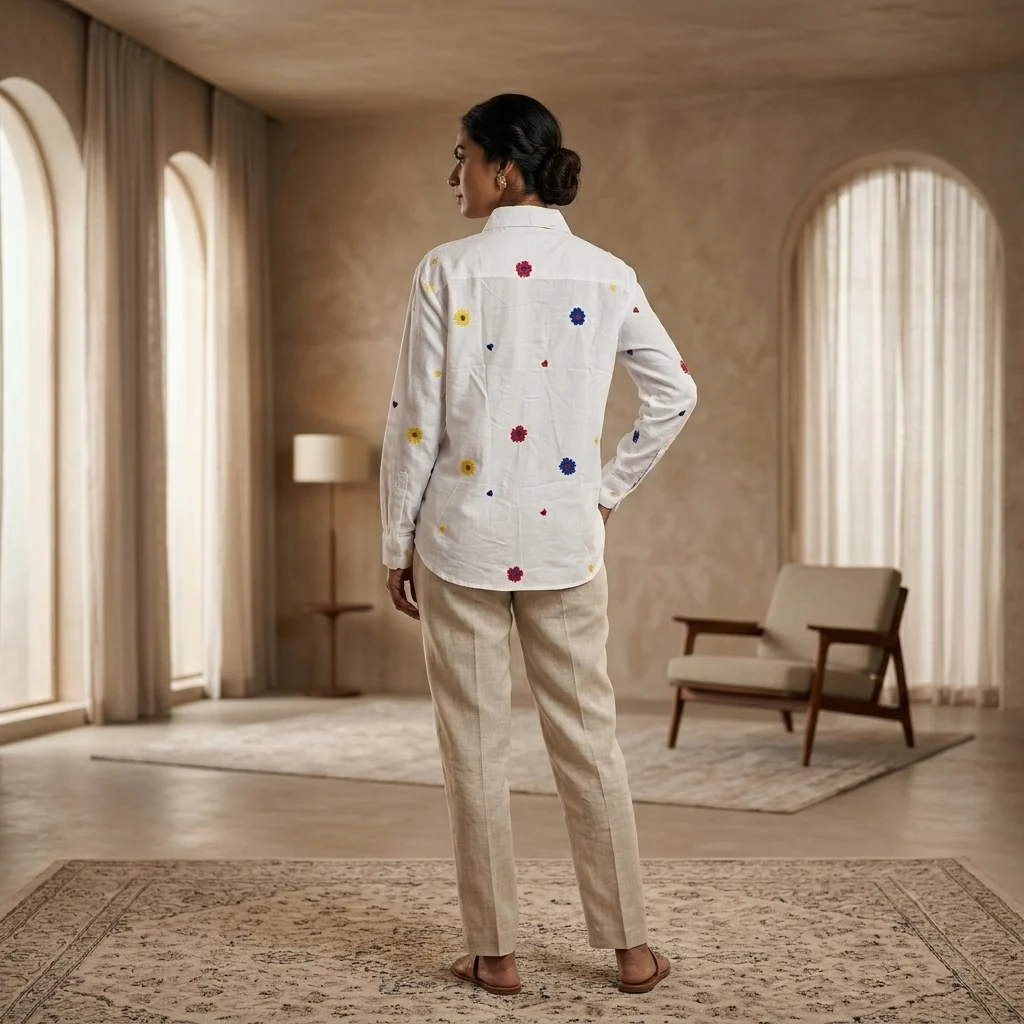 Designed with a focus on both form and function, the shirt features a traditional pointed collar, a neat button-front placket, and full-length sleeves with structured cuffs. Its airy construction ensures a comfortable drape, whether worn tucked into tailored trousers for a professional setting or paired with denim for a breezy, bohemian-inspired outfit. This is the ultimate “elevated basic” for the contemporary Indian wardrobe.