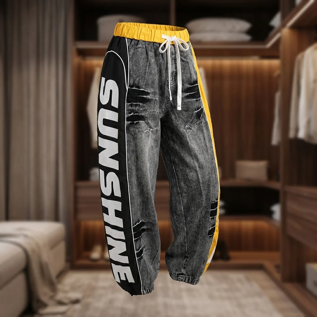 Urban Aesthetic: Features a unique fusion of acid-wash grey denim and vibrant yellow athletic accents for a standout streetwear look.