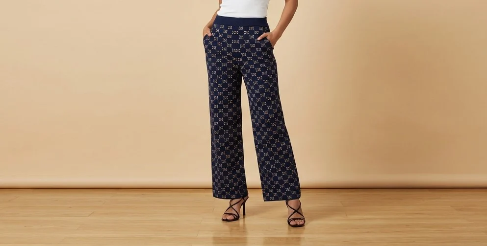 The matching trousers offer a streamlined, straight-leg fit, completely covered in a tonal monogram print that creates a cohesive and elongated look. Crafted from a mid-weight textured knit, this set transitions effortlessly from high-end travel style to chic urban outings. It is a definitive statement piece for those seeking a curated, “put-together” appearance with minimal effort.