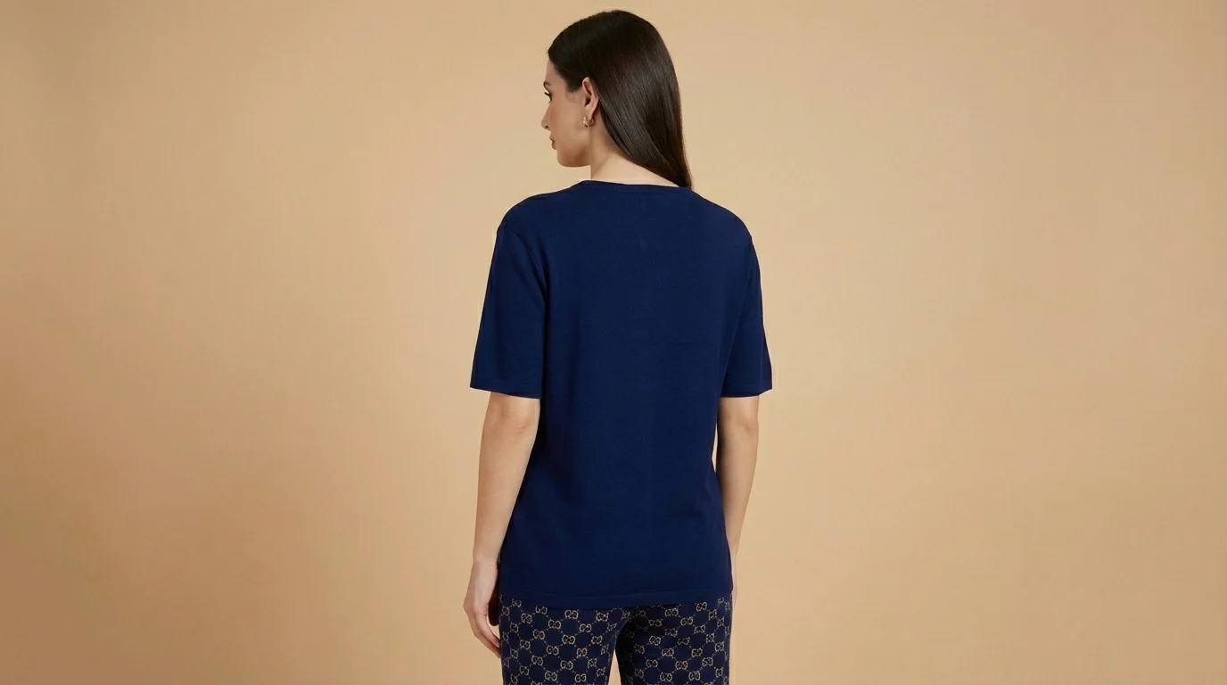 Elevate your loungewear aesthetic with this sophisticated two-piece knit co-ord set. Designed for the modern woman who values both comfort and high-fashion impact, the ensemble features a rich royal blue palette adorned with a signature interlocking monogram pattern. The top is a relaxed, short-sleeve knit featuring a bold, embellished logo at the chest, blending a sporty silhouette with premium detailing.
