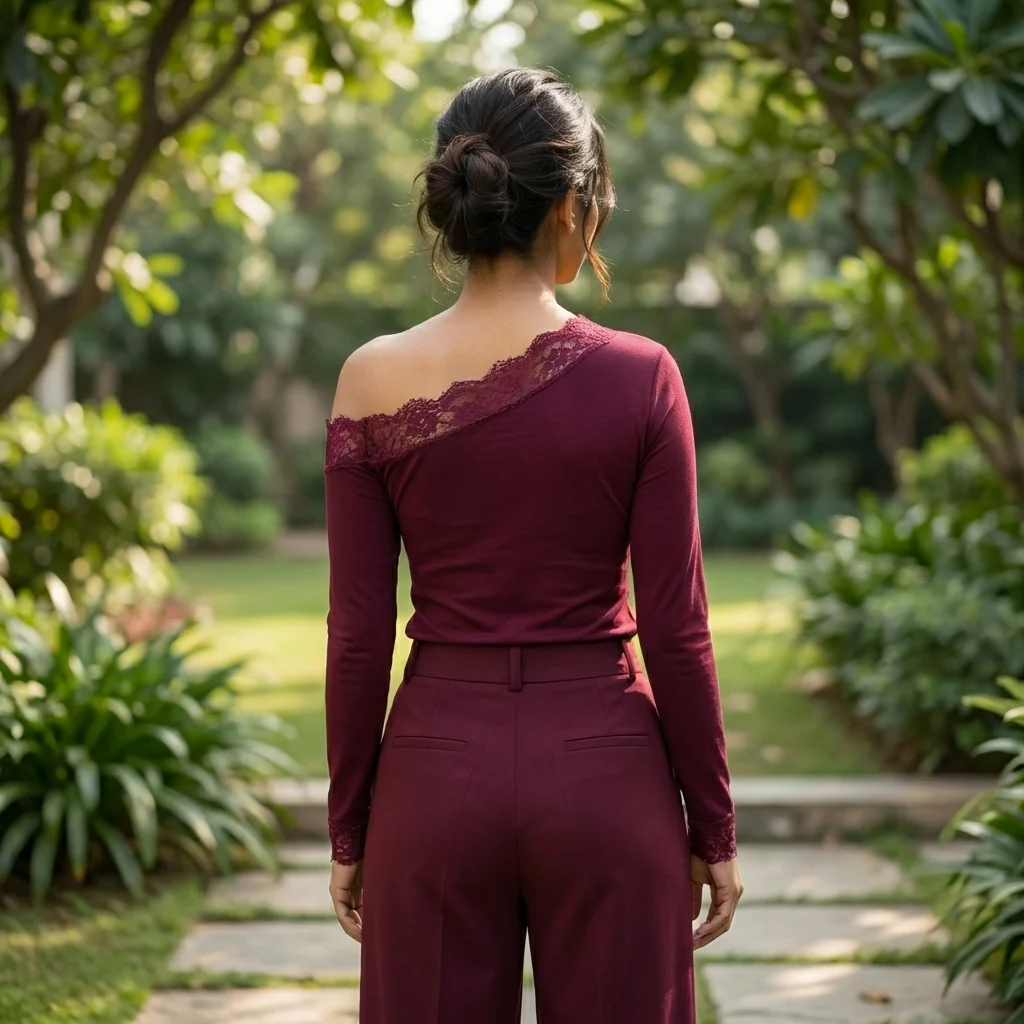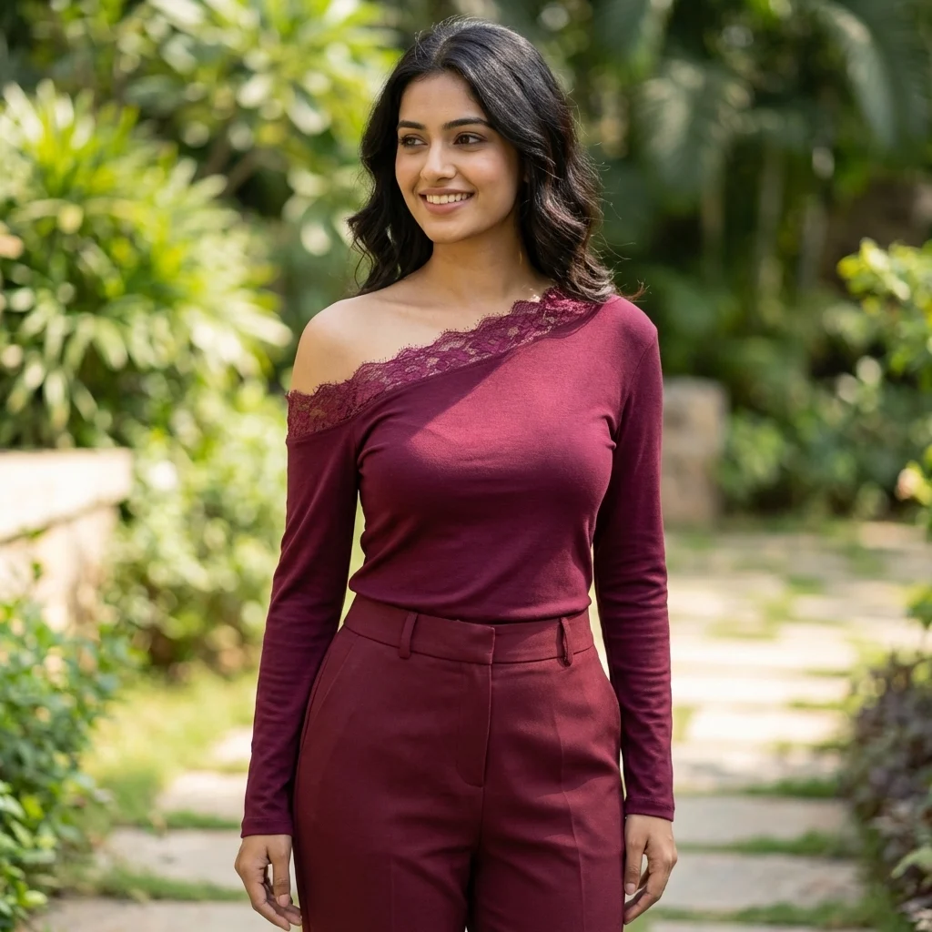 This maroon top strikes a perfect balance between contemporary styling and timeless romanticism. The deep jewel tone provides a rich, versatile base that transitions seamlessly from polished daytime looks to evening social gatherings. The standout feature is the delicate floral lace along the neckline, adding texture and a refined edge to the minimalist design.