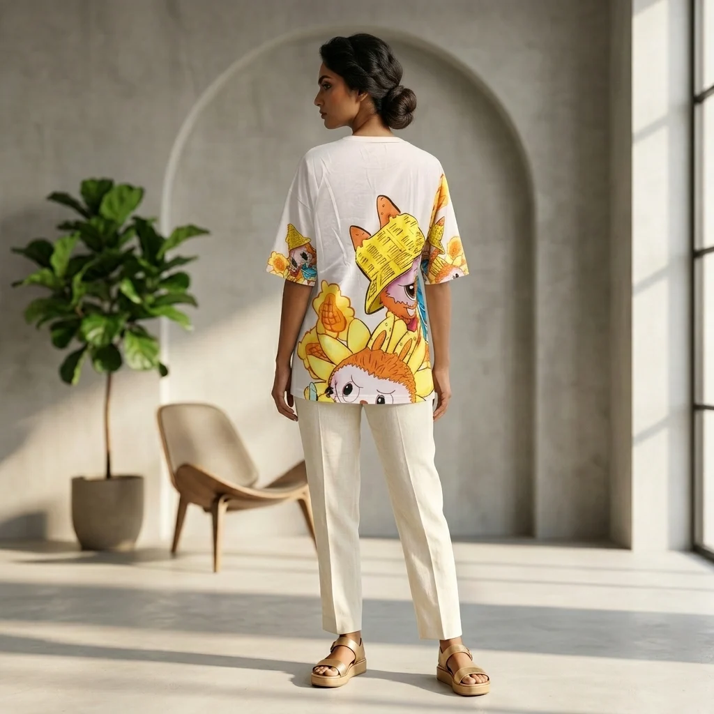 Redefine your everyday basics with this captivating graphic t-shirt. Designed for the modern woman who leans into expressive fashion, this piece serves as a wearable canvas. The front is dominated by an intricate, hand-painted style illustration of whimsical characters and sunflowers, rendered in a rich palette of mustard, amber, and soft pinks.