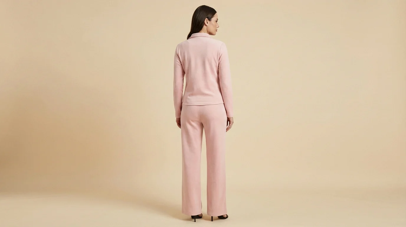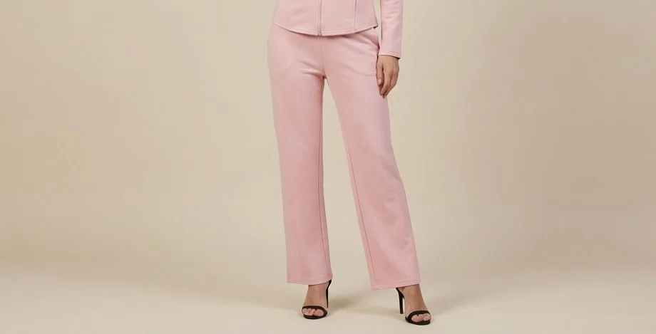 Redefine your off-duty wardrobe with this sophisticated two-piece co-ord set, designed for the modern woman who values both comfort and a polished aesthetic. This ensemble features a meticulously tailored full-zip jacket and matching wide-leg trousers, draped in a soft, breathable pastel pink fabric that transitions effortlessly from relaxed mornings to casual city outings.