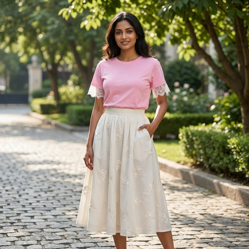 • Model Look: The top is shown tucked in for a structured waistline and worn loose to highlight the lace hem.