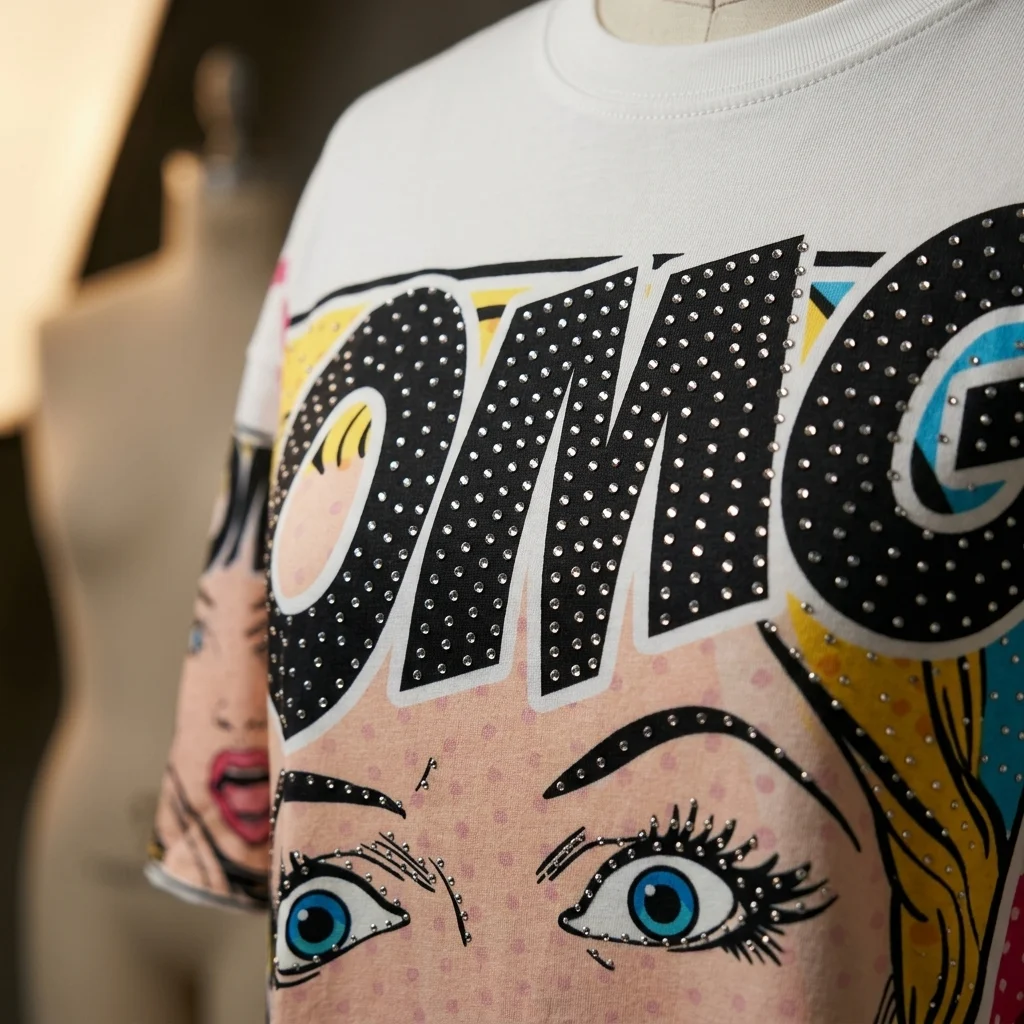 Feature Details SKU ID 70005220260303 Category Women’s Apparel Gender Women Top Type Oversized T-Shirt / Graphic Tee Fabric Premium Cotton Blend (Smooth texture visible) Fit Type Relaxed / Loose Fit Sleeve Type Half Sleeves (Drop Shoulder) Neckline Ribbed Crew Neck Length Regular Hip-Length to Long Pattern / Print Pop Art / Comic Graphic with Rhinestones Occasion Streetwear, Casual Outings, Creative Events Season All-Season / Summer Care Instructions Hand wash cold inside out to protect embellishments. Do not tumble dry.