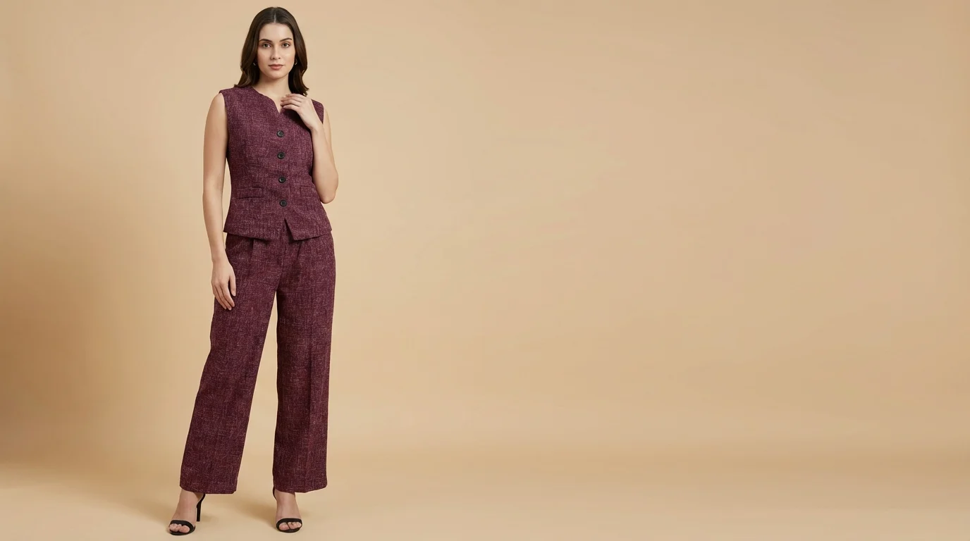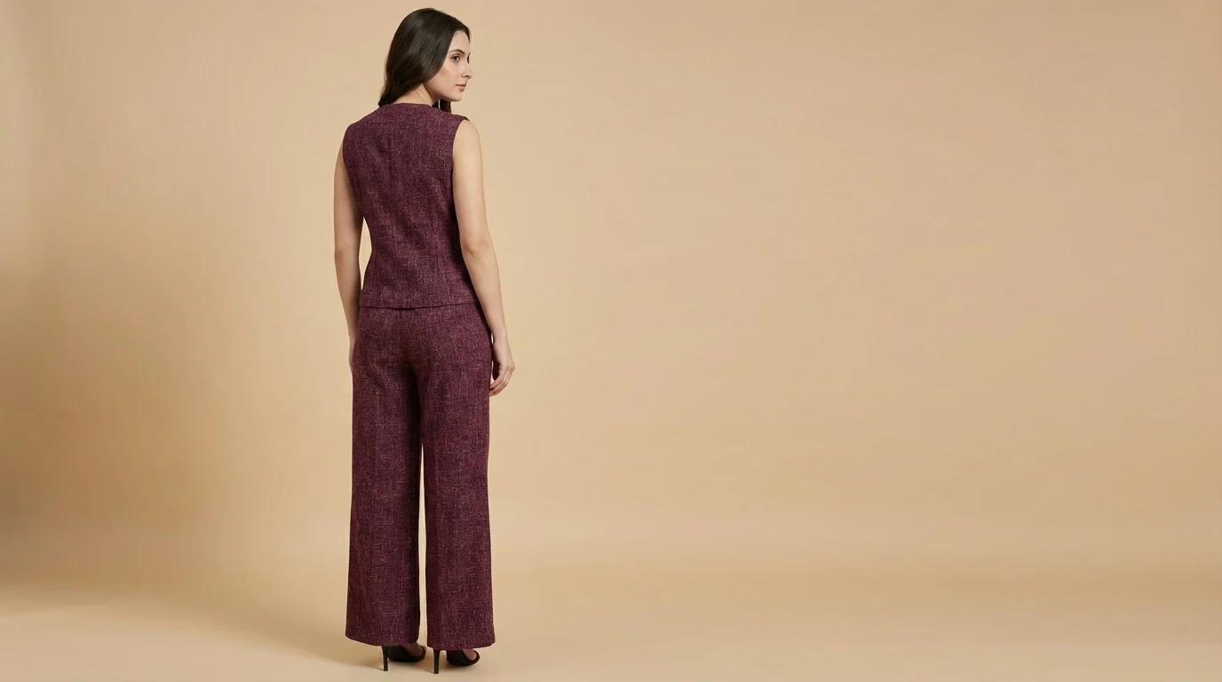 Home » Shop » Women’s Wine Textured Sleeveless Waistcoat and Wide-Leg Trouser Set